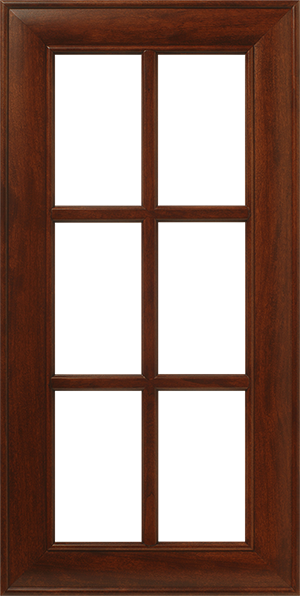 The S900 LP001 Mitered Frame Door design displays a Traditional Colonial 2 x 3 Mullion Pattern that creates a 6 lite opening. This sample is shown in WalzCraft’s Cherry – Natural / Standard Grade wood and our a Cordovan Wipe Stain Finish.